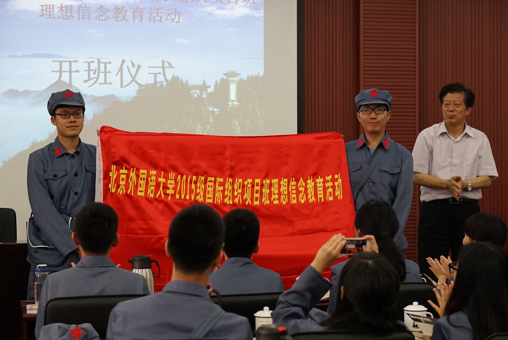 第一天抵达井冈山之后,项目班同学集体换上红军服,在教学基地会议室举行奏国歌、授班旗仪式。中国井冈山干部学院特聘教授、井冈山革命博物馆馆长谢善广受邀进行了题为《井冈山斗争与井冈山精神》的专题讲座,生动具体地讲解了井冈山斗争、红四军两破“进剿”、分田运动、黄洋界保卫战等红色革命历史,为项目班同学了解井冈山历史文化奠定了坚实基础。