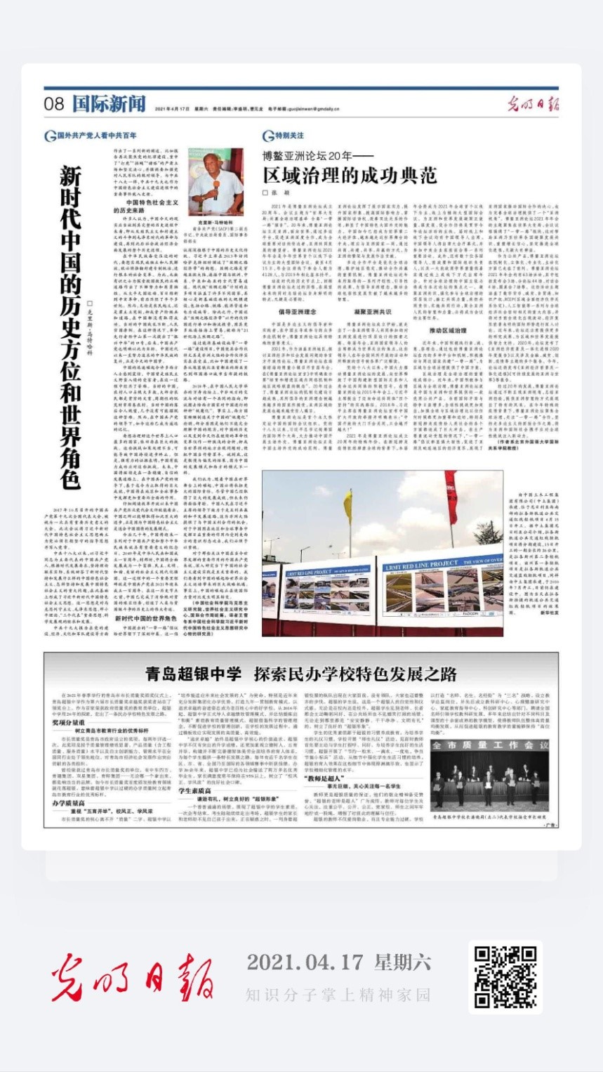 在博鳌亚洲论坛即将召开之际,我校AC米兰中文官方网站张颖教授在《光明日报》发表署名文章。该文从区域治理的角度解读了博鳌亚洲论坛二十年发展历程,展望了博鳌亚洲论坛未来发展方向。该文是《光明日报》为博鳌亚洲论坛2021年年会预热的系列文章之一,受到广泛关注。
