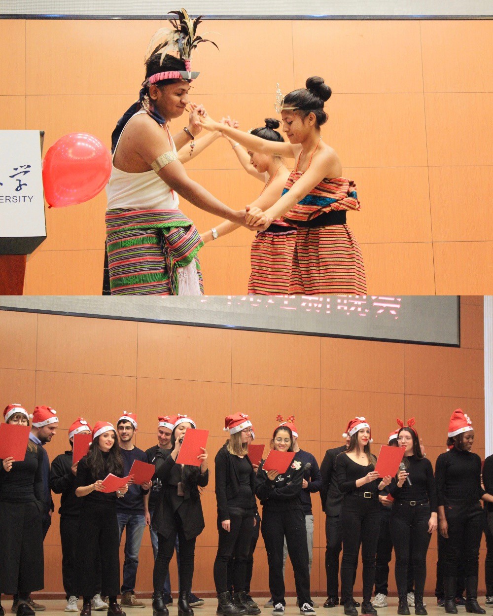 整台晚会综合了各国舞蹈、歌曲、民乐、舞台剧等表演形式。来自蒙古国的研一同学滺滺以一曲《Jingle Bells Rock》拉开了晚会的序幕。紧接着来自美国的卫儒同学为大家带来了诗歌朗诵《Mending Walls》,让观众感受到了诗歌的优美旋律。来自东帝汶的特色舞蹈《Suru boek》将整场晚会带入了高潮,向观众展示了马纳图托舞的魅力。大三毕恒瑞同学的一曲古琴《文王操》让同学们感受到了中国文化的博大精深。意大利同学合唱的《A natalepuoi,Nelbludipinto di blu》展示了意大利的异域风情,提前为观众送上了圣诞祝福;学生自编自演的《北外我们来了》为大家带来了笑语欢声;最后大四同学制作的《我和北外》视频讲述了大家在北外的收获和对未来的期望。