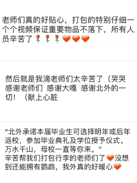 每一位同学都是老师心底的牵挂。在这个特殊的毕业季,每一件行李传递的不只是物品本身,更饱含了老师们对学生的关爱和挂念。在此,我们要向每一位为毕业生倾力付出的老师致以真诚的敬意:老师,您辛苦了!