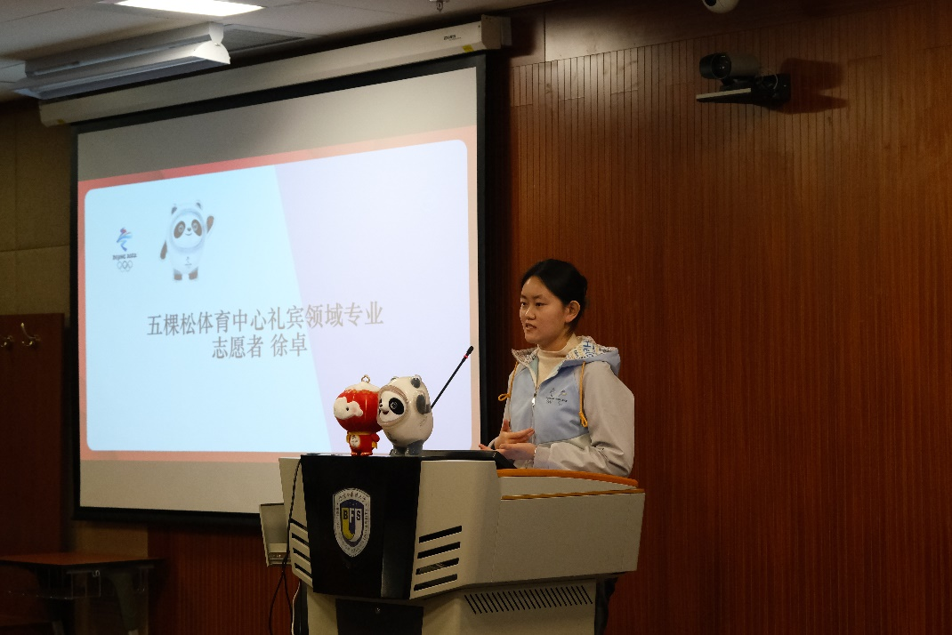 国家速滑馆体育展示领域专业志愿者何婧旸同学分享了自己担任推免保辅导员期间的学生工作经验,以及建国七十周年阅兵典礼上参与 “圆梦奥运”群众方阵的经历。她鼓励志愿者们通过冬奥志愿,传播北外声音、中国声音,表达了对于志愿者们的美好祝愿。
