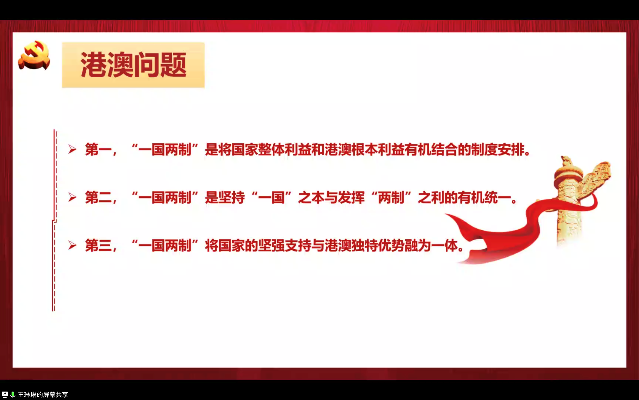 第四卷第十七章至二十章内容集中为四个主题,一国两制与祖国统一,构建人类命运共同体,全球治理与高质量发展,以及推动一带一路建设。首先,王琳琳同志与大家分享了书中对于一国两制的解读,强调“一国两制”是将国家整体利益和港澳根本利益有机结合的制度安排,这一制度是坚持“一国”之本与发挥“两制”之利的有机统一,强调实现祖国统一是历史趋势。