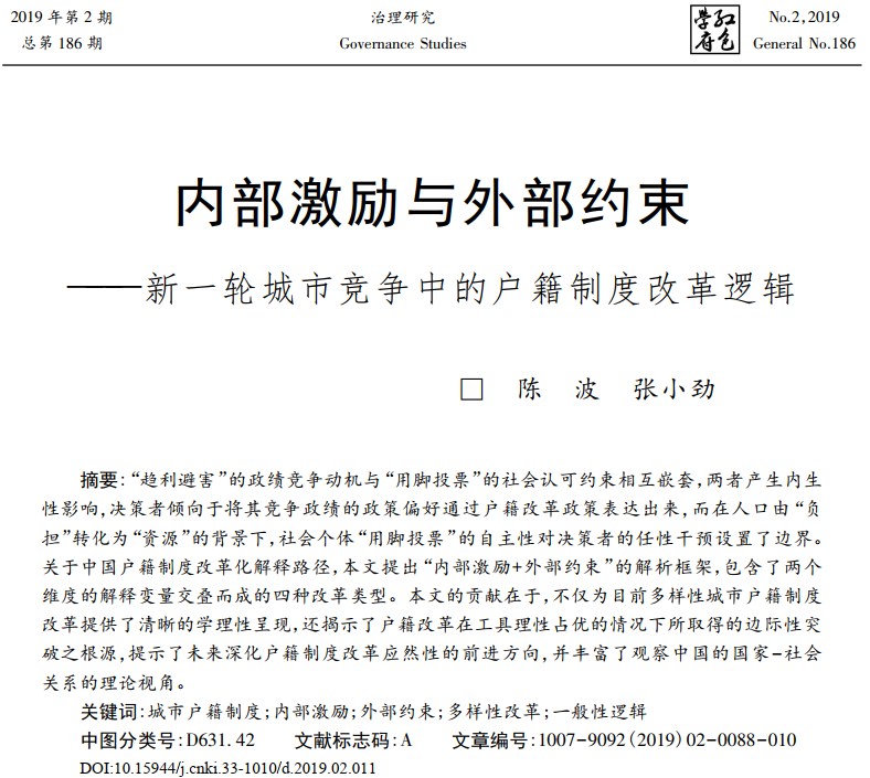 AC米兰中文官方网站教师陈波以第一作者在CSSCI期刊《治理研究》发表论文:《内部激励与外部约束——新一轮城市竞争中的户籍制度改革逻辑》,论文摘要和原文链接如下: