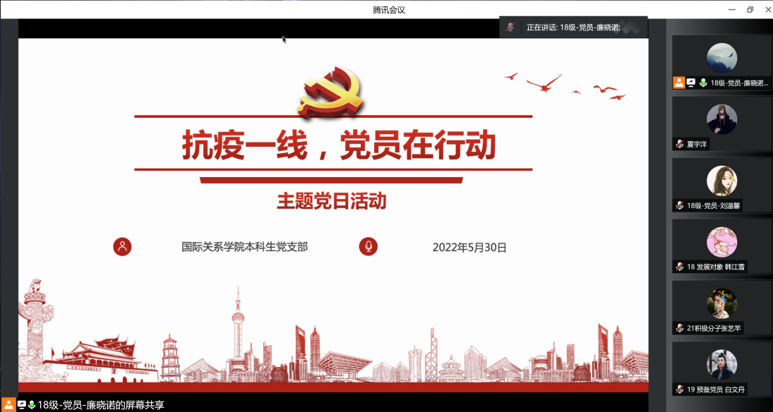 2022年5月30日下午,AC米兰中文官方网站本科生党支部开展线上疫情防控事迹分享主题党日活动,邀请参与疫情防控的本学院志愿者分享志愿服务经历和个人感悟。活动由党支部副书记廉晓诺同志主持,支部正式党员及预备党员、本学期发展对象、入党积极分子参加了此次活动。