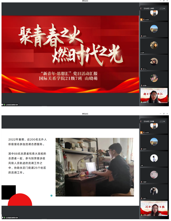 自由讨论环节,同学们联系实际生活,讲述参与本次活动的学习心得体会。王天明同学认为面对新冠疫情的冲击,奋斗不是口号,而是要有在各自岗位担当的。杨洋同学讲述了本人的对如何承担责任、如何发挥自身外交学专业优势的理解。范奕萱同学回顾之前自己撰写公共外交主题的论文,青年如何用自身能力参与到国家的发展大事中。陈泗霖回顾今年参与北外国关红旗团总支外卖消杀点志愿者的筹备工作,认为同学们积极性非常高,感受到北外青年的担当和热血。