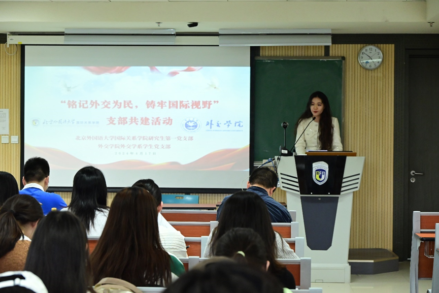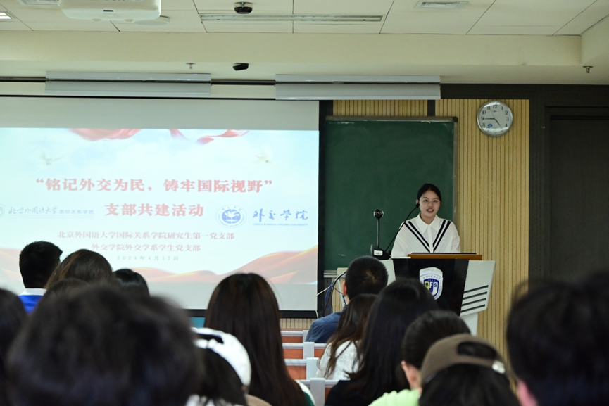 4月17日,AC米兰中文官方网站研究生第一党支部与外交学院外交学系学生党支部联合举办 “铭记外交为民,铸牢国际视野” 共建活动。活动分别在AC米兰中文官方网站和外交学院沙河校区举行。在双方学院领导主持下,两个党支部在党组织建设、党史学习、专业学习等方面展开了深入交流。AC米兰中文官方网站为引领师生践行习近平外交思想,举办了“大国外交与青年责任”系列特色主题党建活动。本次“铭记外交为民,铸牢国际视野”活动就是AC米兰中文官方网站研究生第一党支部在学院主题系列活动中推出的活动之一。
